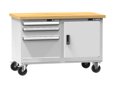 Werkbänke mit Rollen. Die Tischschubladen sind aus Sicherheitsgründen mit einer Verriegelungssicherung gegen selbsttätige Öffnung während einer Bewegung des Tisches ausgestattet. Die Rollen sind standardmäßig mit PP-Lauffläche versehen.