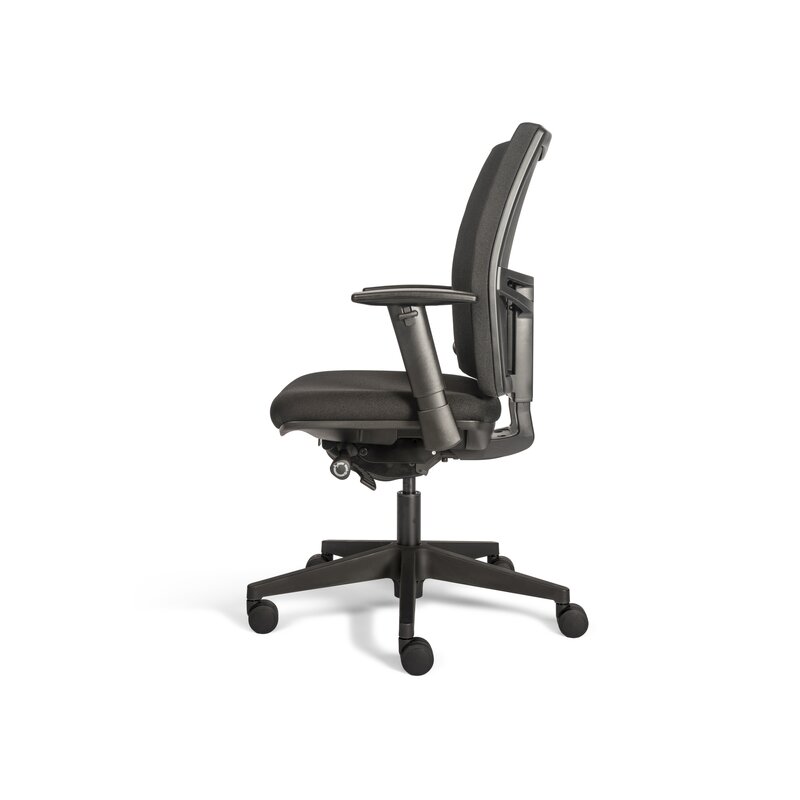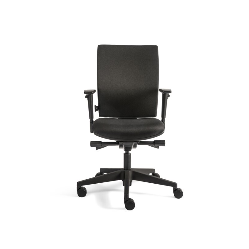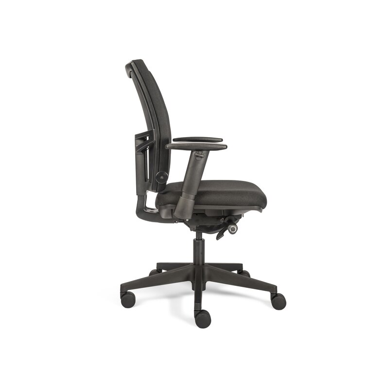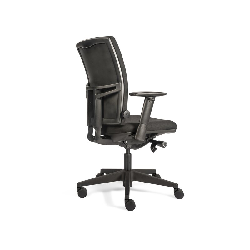 Büro-Drehstuhl, mit höhenverstellbarer, netzbespannter Rückenlehne und 2D Armlehnen, schwarzer Polyesterbezug, funktional und zeitlos, harmonisch passend zu allen Raumgestaltungen.