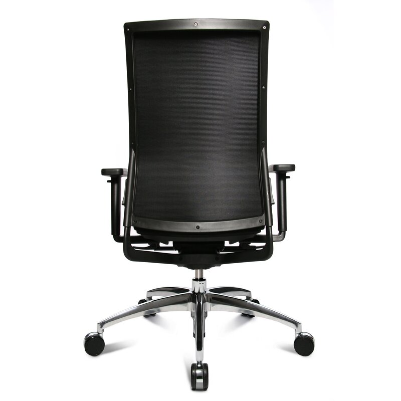 Chefsessel Comfort E 100-3 mit hoher, höhenverstellbarer, netzbespannter Rückenlehne, Muldensitz mit Sitztiefen- und Sitzneigeverstellung, Stoffbezug in schwarz, 3D Armlehnen mit schwenkbarer Auflage, Punktsynchronmechanik, Kunststofffußkreuz mit lastabhängig gebremsten, harten Doppellaufrollen, TÜV/GS zertifiziert.
