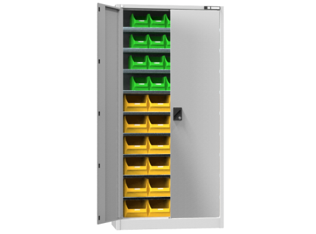 Ausgeklügelte stabile Bauart aus Stahlblech, hochwertige Lackierung und Werkstattverarbeitung unter Anwendung von modernen Automatisierungssystemen. Das ist das nächste Produkt aus der Familie der Werkstattmöbel Die Werkstattschränke sind für anspruchsvolle Bedingungen, nicht nur in Maschinenbaubetrieben, entworfen. Unsere Schränke helfen Ihnen mit der Ordnung, Übersicht und Aufbewahrung Ihres Materials. Schränke der UK-Serie mit Flügeltüren und einem größeren Öffnungswinkel als 90° stellen eine leichtere Form der Werkstattschränke dar. Sie werden vor allem für die Aufbewahrung von leichterem Material mit kleineren Abmessungen, bzw. als Aufbewahrungsort für Kunststoffboxen für Kleinteile benutzt. Bei den Varianten mit Glastüren wird gehärtetes Sicherheitsglas verwendet. Die Schränke sind mit einem Schloss mit einem Zweipunktschließsystem mit geräuschlosem Gang versehen. Die Fachböden sind verstellbar.