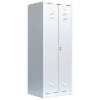 Bemerkungen: 2 Abteile, Abteilbreite ca. 400 mm, Drehriegelverschluss für Vorhangschloss mit bis zu 5 mm Bügelstärke (Vorhangschloss nicht im Lieferumfang enthalten), Fach- und Abteilböden glatt auskehrbar, GS-zertifiziert für geprüfte Sicherheit und Qualität , Korpus und Türen elektrostatisch, glatt pulverbeschichtet, Lieferung: Komplett verschweißt - keine Montage erforderlich, Links 4 fest verschweißte Fachböden, Rechts 1 fest verschweißter Hutboden mit Ovalprofil-Garderobenstange und 3 verschiebbaren Kleiderhaken aus Kunststoff, Türen mit Kastenverstärkung, Lüftungsschlitzen und eingestanztem Etikettenrahmen 30 x 50 mm, Türen mittig schließend, an gefederten Stiftscharnieren befestigt