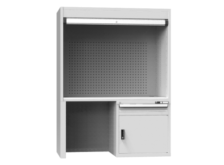 Die KZ-Prüfarbeitsplätze betonen die Systemfähigkeit und das Baukastenprinzip. Infolgedessen können die Prüfarbeitsplätze um neue Ausstattung und weitere Nutzungsmöglichkeiten erweitert werden. Der obere Bereich ist mit einem Aluminiumrollladen mit Aufrollmechanismus absperrbar. Der Rollladen endet mit einem Alu-Griff mit integriertem Drehstangenschloss. Der untere Teil mit Standardgestell in der Größe 36 x 36D ermöglicht die Verwendung von Schubladen mit Vollauszügen. Bei der Verwendung eines Computermoduls empfehlen wir, eine speziell angepasste Computerschublade für die Tastatur zu verwenden. Die Arbeitsplatte ist mit Kabeltüllen versehen. Der unbestreitbare Vorteil ist die Ausführung, dank welcher der Mitarbeiter sitzen kann. Wir liefern die KZ-Prüfarbeitsplätze in zerlegtem Zustand, Verbindungsmaterial ist Bestandteil der Lieferung. Für diese Prüfarbeitsplatztypen haben wir eine Computerschublade im Angebot, die den KZ-Modulen angepasst ist.