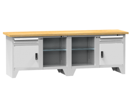 Tische mit robuster Konstruktion. Es handelt sich um die schwersten, standardmäßig gelieferten Tische aus unserem Produktionssortiment der Werkstattmöbel. Sie werden aus einzelnen Modulen zusammengestellt, die wiederum mit einer Reihe von Schubladenschränken, Türen und Einteilungen u. ä. ausgestattet werden.