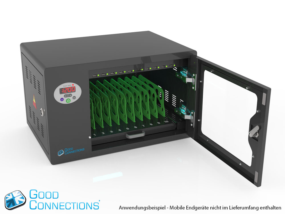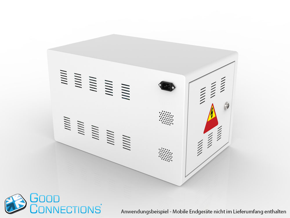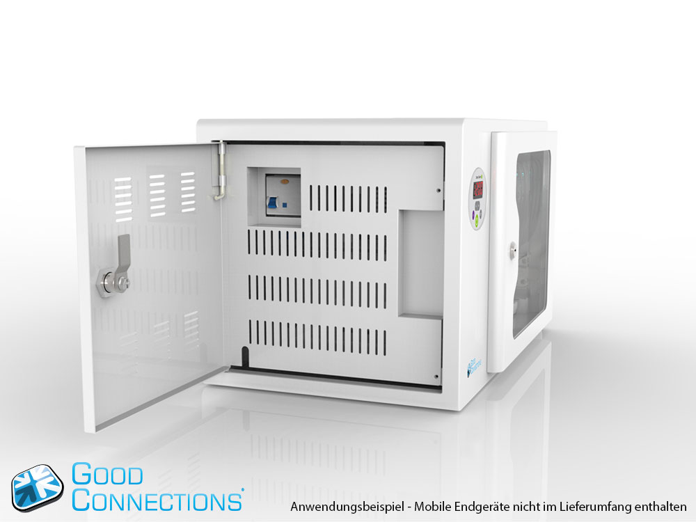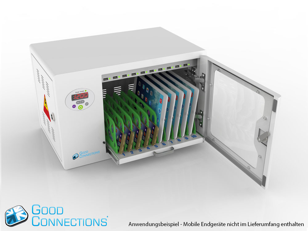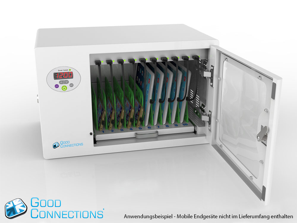 Mit dem innovativen Tablet-Ladewagen begleitet Sie Good Connections® auf den Weg der Digitalisierung und sorgt dafür, dass ihre Geräte immer einsatzbereit und geladen sind, wenn sie gebraucht werden. Sichere Aufbewahrung und energieeffiziente sowie ressourcenschonende Ladetechnik – durch seine Flexibilität und Vielseitigkeit ist der UL-zertifizierte Tablet-Ladewagen von Good Connections® der ideale Begleiter für Ihr Projekt im Bildungswesen, Gesundheitswesen, Industrie, Tagungsstätten, Hotels und der Gastronomie. Machen Sie sich keine Gedanken mehr darüber ob Sie das passende Ladegerät für ihr Tablet zur Hand haben, denn durch die USB-Ports mit intelligenter IC-Ladesteuerung benötigen Sie nur noch eine Standard-Steckdose für bis zu 65 Tablets. Eine in jeder Ladeebene angebrachte UV-C Lampe sorgt umweltfreundlich und ohne Chemie für sterilere Verhältnisse und eine verbesserte Hygiene. Die ausziehbaren und nummerierten Fächer dienen der einfachen Zuordnung der Geräte zu den einzelnen Nutzern.