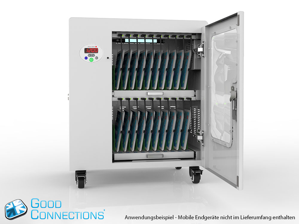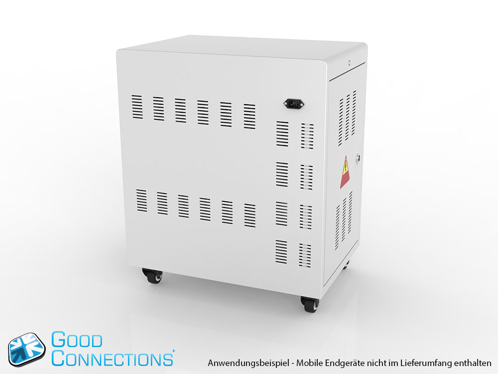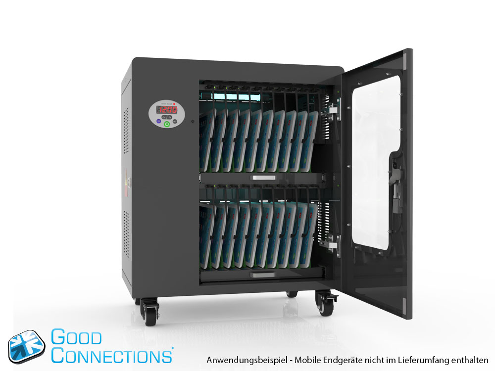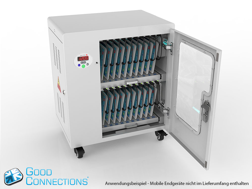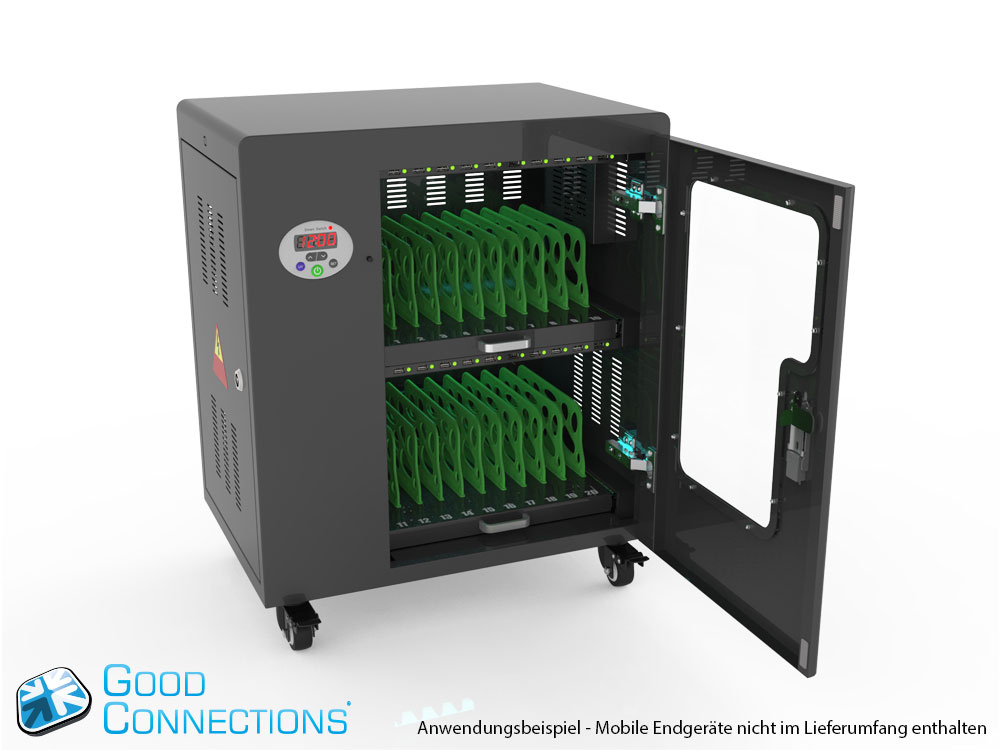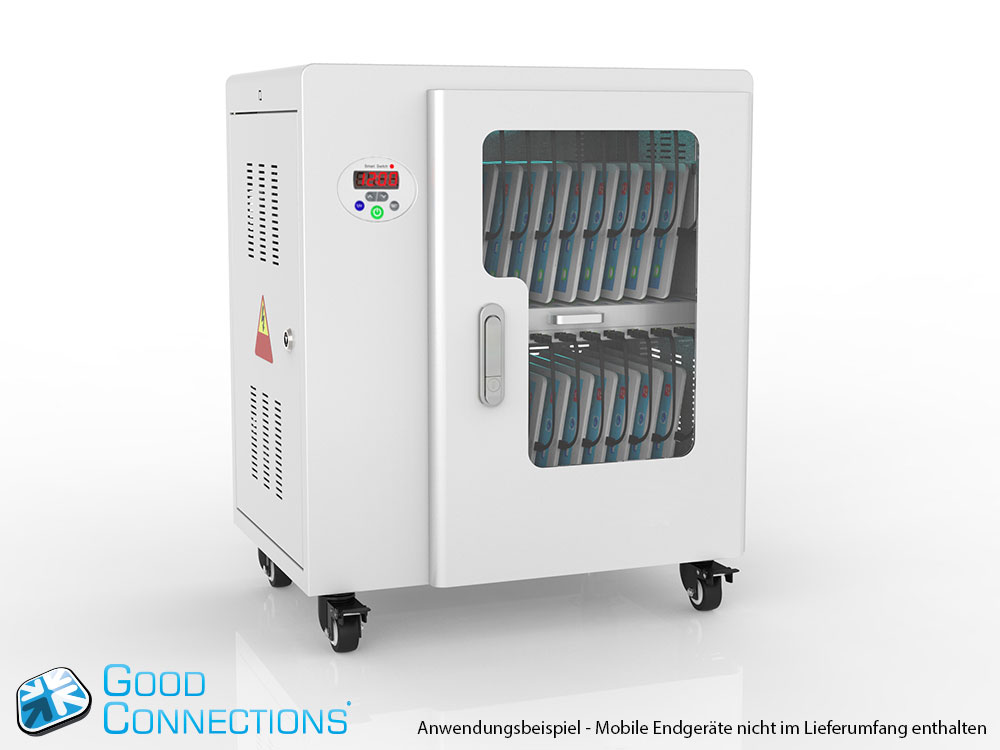 Mit dem innovativen Tablet-Ladewagen begleitet Sie Good Connections® auf den Weg der Digitalisierung und sorgt dafür, dass ihre Geräte immer einsatzbereit und geladen sind, wenn sie gebraucht werden. Sichere Aufbewahrung und energieeffiziente sowie ressourcenschonende Ladetechnik – durch seine Flexibilität und Vielseitigkeit ist der UL-zertifizierte Tablet-Ladewagen von Good Connections® der ideale Begleiter für Ihr Projekt im Bildungswesen, Gesundheitswesen, Industrie, Tagungsstätten, Hotels und der Gastronomie. Machen Sie sich keine Gedanken mehr darüber ob Sie das passende Ladegerät für ihr Tablet zur Hand haben, denn durch die USB-Ports mit intelligenter IC-Ladesteuerung benötigen Sie nur noch eine Standard-Steckdose für bis zu 65 Tablets. Eine in jeder Ladeebene angebrachte UV-C Lampe sorgt umweltfreundlich und ohne Chemie für sterilere Verhältnisse und eine verbesserte Hygiene. Die ausziehbaren und nummerierten Fächer dienen der einfachen Zuordnung der Geräte zu den einzelnen Nutzern.