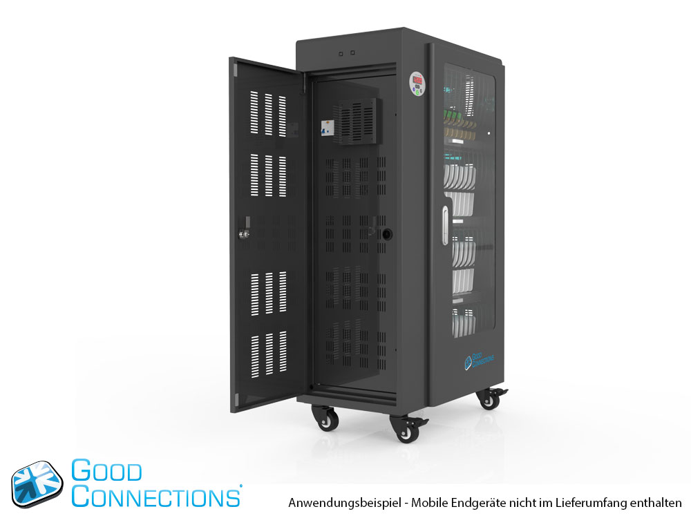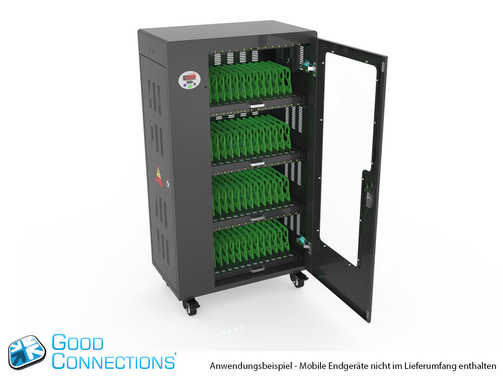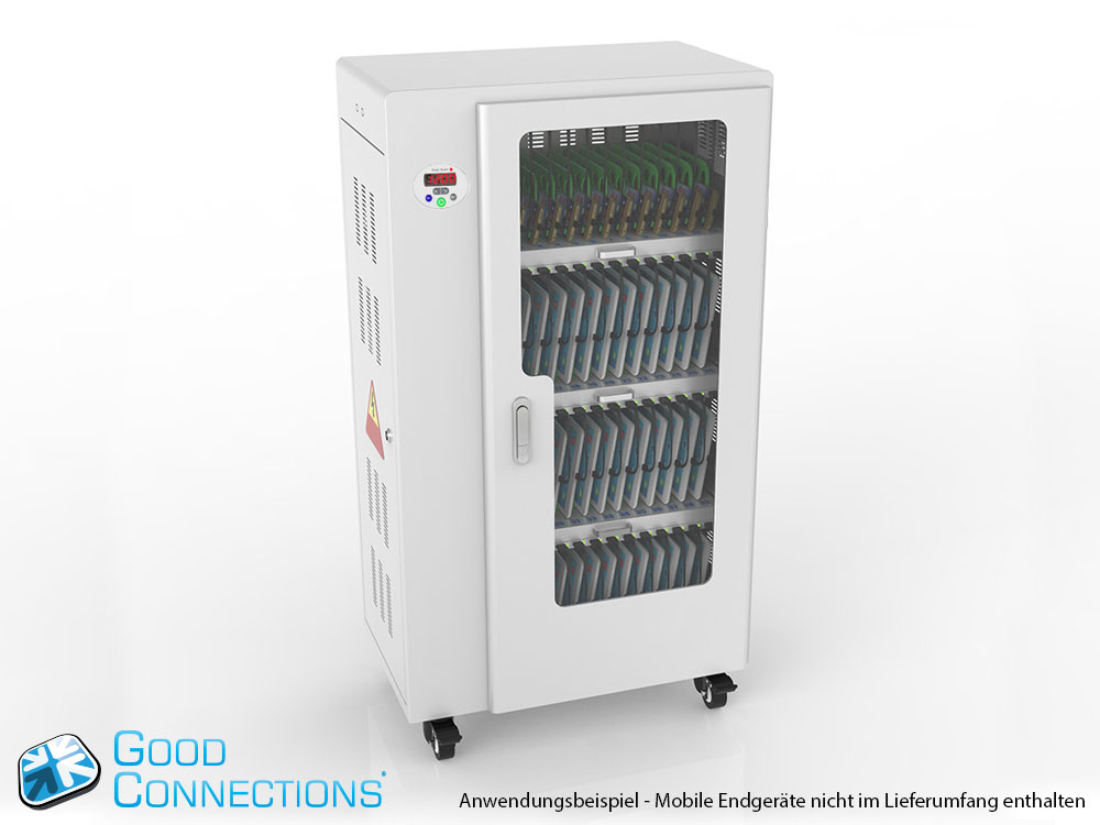 Mit dem innovativen Tablet-Ladewagen begleitet Sie Good Connections® auf den Weg der Digitalisierung und sorgt dafür, dass ihre Geräte immer einsatzbereit und geladen sind, wenn sie gebraucht werden. Sichere Aufbewahrung und energieeffiziente sowie ressourcenschonende Ladetechnik – durch seine Flexibilität und Vielseitigkeit ist der UL-zertifizierte Tablet-Ladewagen von Good Connections® der ideale Begleiter für Ihr Projekt im Bildungswesen, Gesundheitswesen, Industrie, Tagungsstätten, Hotels und der Gastronomie. Machen Sie sich keine Gedanken mehr darüber ob Sie das passende Ladegerät für ihr Tablet zur Hand haben, denn durch die USB-Ports mit intelligenter IC-Ladesteuerung benötigen Sie nur noch eine Standard-Steckdose für bis zu 65 Tablets. Eine in jeder Ladeebene angebrachte UV-C Lampe sorgt umweltfreundlich und ohne Chemie für sterilere Verhältnisse und eine verbesserte Hygiene. Die ausziehbaren und nummerierten Fächer dienen der einfachen Zuordnung der Geräte zu den einzelnen Nutzern.