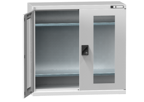 Bei den Varianten mit Glastüren wird gehärtetes Sicherheitsglas verwendet. Die Schränke sind mit einem Zweipunktschließsystem mit geräuschlosem Gang versehen.