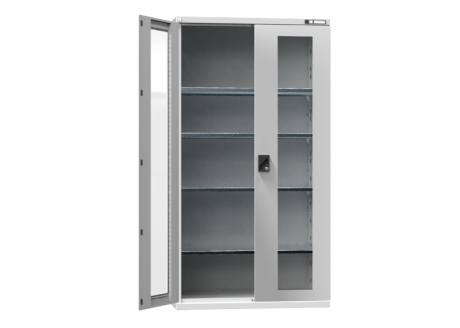 Bei den Varianten mit Glastüren wird gehärtetes Sicherheitsglas verwendet. Die Schränke sind mit einem Zweipunktschließsystem mit geräuschlosem Gang versehen.