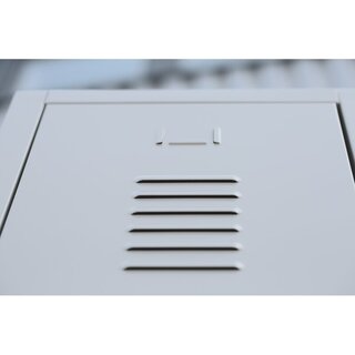 Bemerkungen: Drehriegelverschluss für Vorhangschloss mit bis zu 5 mm Bügelstärke (Vorhangschloss nicht im Lieferumfang enthalten), Fach- und Abteilböden glatt auskehrbar, GS-zertifiziert für geprüfte Sicherheit und Qualität , Korpus und Türen elektrostatisch, glatt pulverbeschichtet, Lieferung: Komplett verschweißt - keine Montage erforderlich, Links 4 fest verschweißte Fachböden, Rechts 1 fest verschweißter Hutboden mit Ovalprofil-Garderobenstange und 3 verschiebbaren Kleiderhaken aus Kunststoff, Türen mit Kastenverstärkung, Lüftungsschlitzen und eingestanztem Etikettenrahmen 30 x 50 mm, Türen mittig schließend, an gefederten Stiftscharnieren befestigt