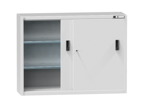 geeignet für Räume, in denen mangels Platz keine Schränke mit Flügeltüren eingebaut werden können. Die Schrabkvarianten mit Glastüren biten zum Unterschied von Schränken mit Vollblechtüren den vorteil, des sofoortigen Überblicks üner das aufbewahrte Material. Die gläserne Türfüllung ist aus gehärtetem Sicherheitsglas. Die Schränke sind mit einem Schloss mit Spreizmechanismus abschließbar. Die verzinkten Fachböden sind in 25 mm Abständen verstellbar.