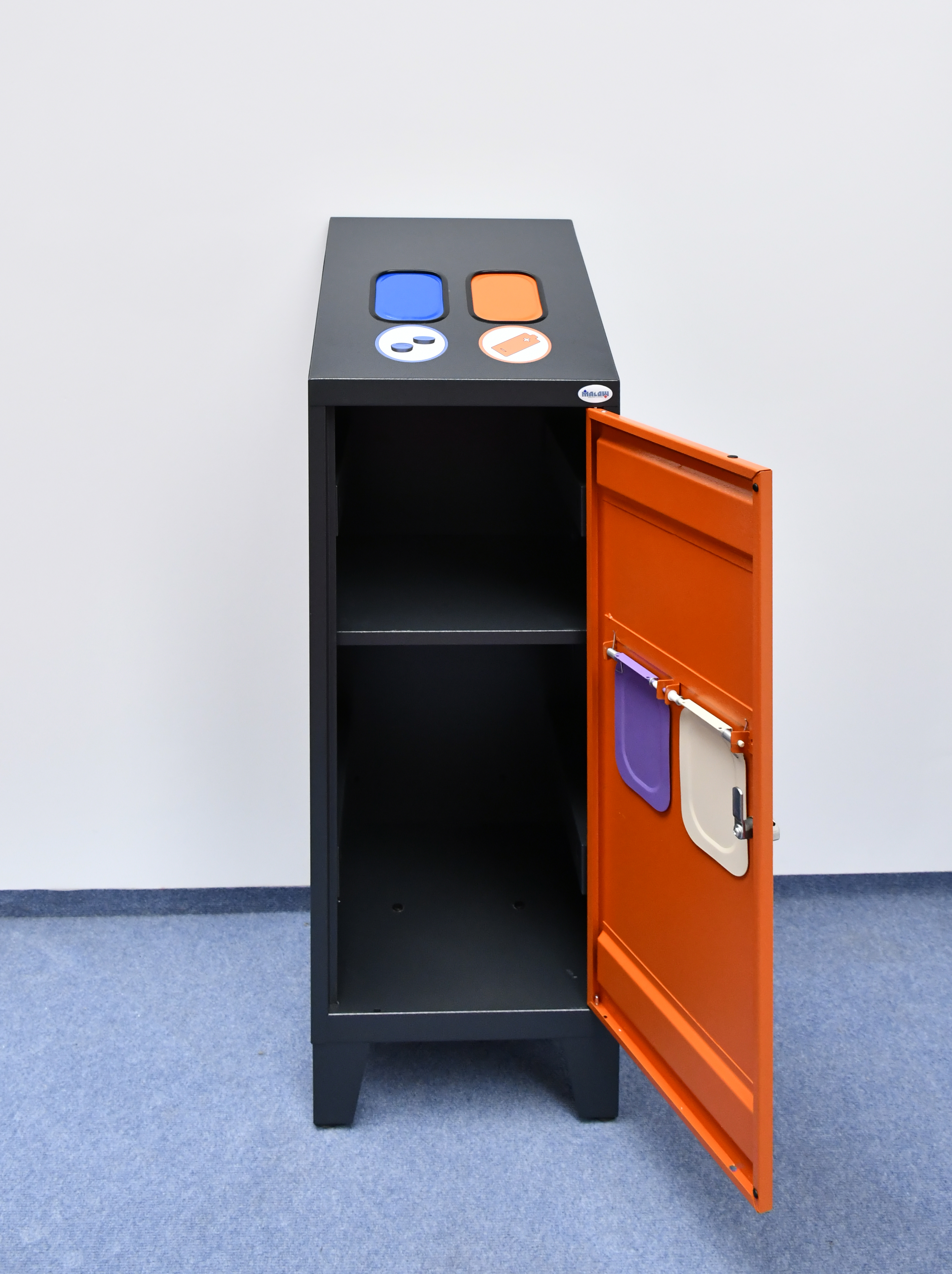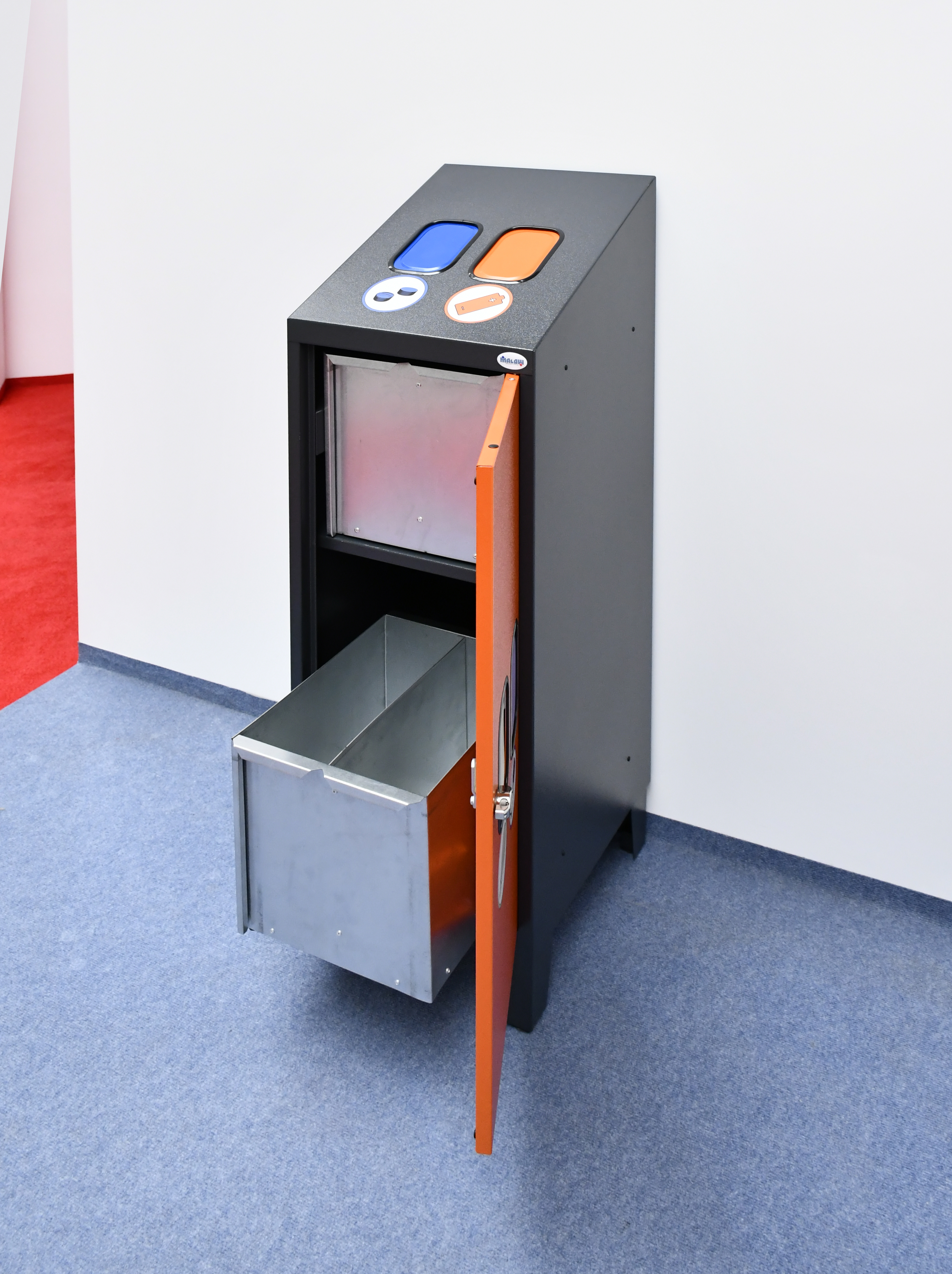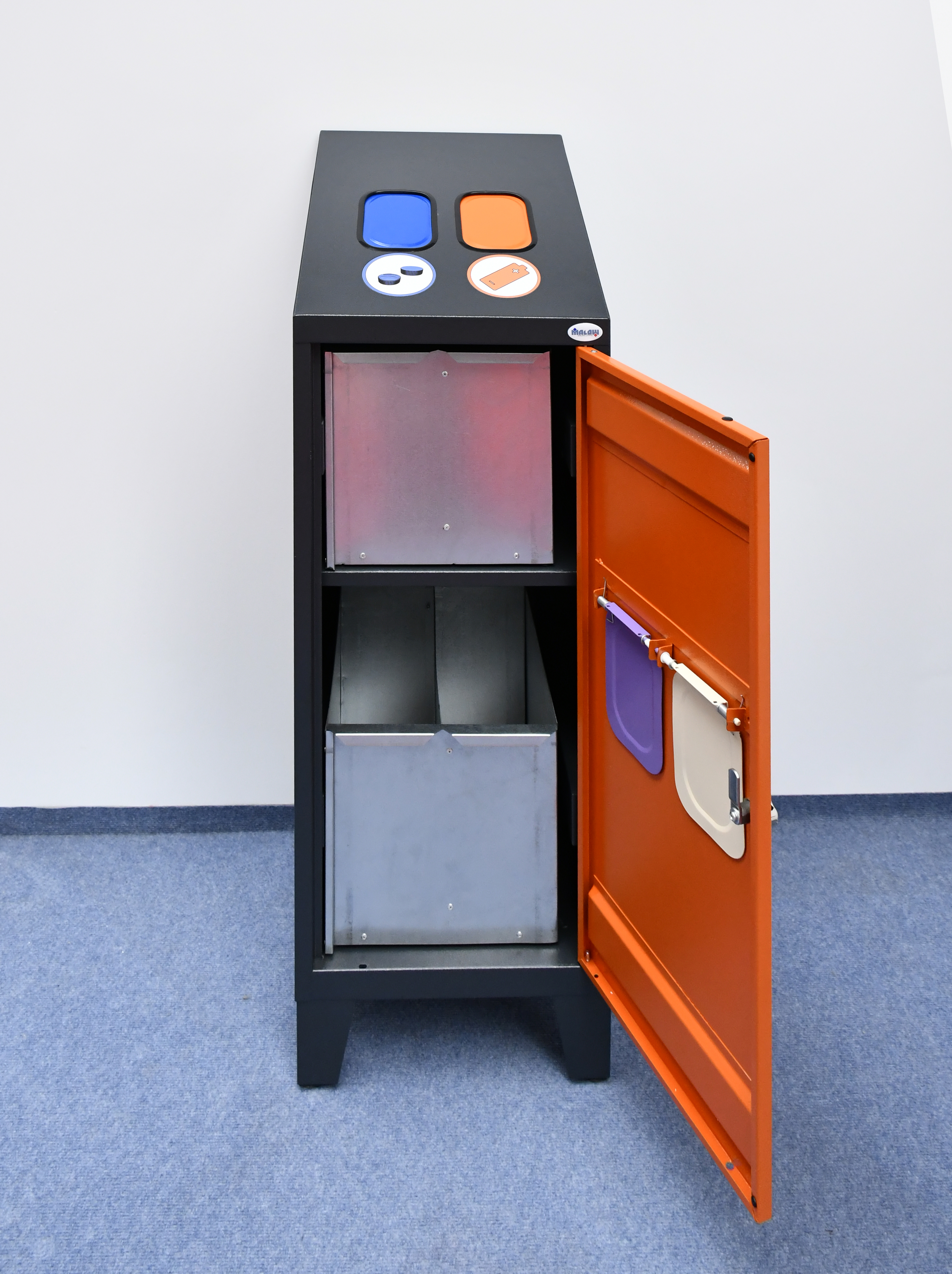 | Bemerkungen: | 0,8-1,0 mm dicker Stahl, 4 Behälter, Selbstschließende Deckel verhindern Gerüche, abgeschrägte Oberseite , für Kleinstmüll, mit Strukturpulverbeschichtung, verschließbare Türen zur leichten Entsorgung |