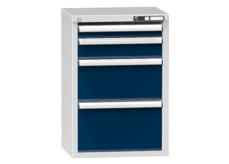 Für die Marke sind die hoch geschätzte Systemfähigkeit und Variabilität der Produkte typisch. Das variable Programm unserer Schubladenschränke entspricht genau Ihren Bedürfnissen und Wünschen. Die hochwertigen Schubladenschränke werden mit den neuesten automatisierten Herstellungsverfahren produziert, die hohe Qualität und Genauigkeit gewährleisten. Die Schubladengehäuse sind aus einzelnen Bauteilen aus hochwertigem Stahlblech verschweißt. Die innere Konstruktion der Gehäuse ist mit einer Lochung in 25 mm Abständen versehen. Diese Lochung wird zur Befestigung und Höhenanordnung der Schubladenführungsschienen und Gestaltung der gewünschten Schubladenkonfiguration genutzt. Die Führungsschienen bzw. Fachbodenhaken können einfach und sehr schnell ohne Werkzeug verstellt werden. Der Schubladenschrank ist mit Zentralschließung und Schubladenverriegelung versehen. Schubladen sind das Basiselement für die Lagerung von Ware und erfüllen daher hohe Anforderungen an Festigkeit und Stabilität.