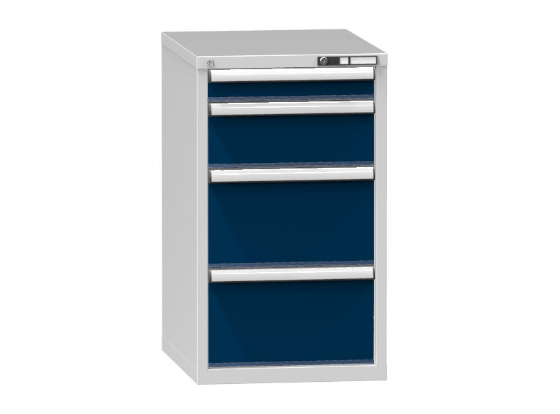 Die Führungsschienen bzw. Fachbodenhaken können einfach und sehr schnell ohne Werkzeug verstellt werden. Der Schubladenschrank ist mit Zentralschließung und Schubladenverriegelung versehen. Schubladen sind das Basiselement für die Lagerung von Ware und erfüllen daher hohe Anforderungen an Festigkeit und Stabilität.