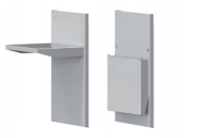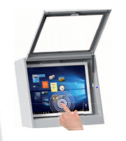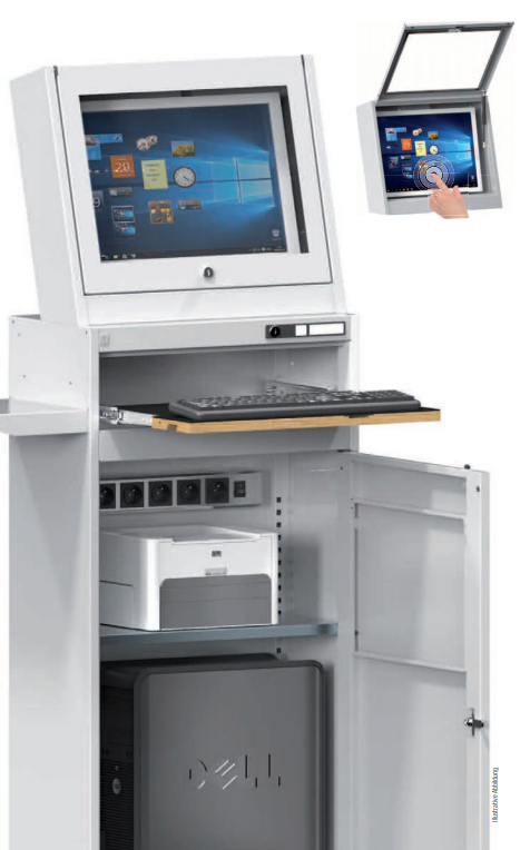 Bildschirmschrank mit Klapptür: Der Bildschirmschrank ist mit Sicherheitsglas, Klapptür und verstellbarer Aufnahme des Bildschirms versehen. Der Bildschirm kann in drei Höhenpositionen gesetzt werden. Das einfache Ausklappen wird mithilfe einer Gasstütze gesichert. Die maximale Bildschirmbreite ist 510 mm. Der Abstand der Bildschirmaufnahme ist 75 x 75 mm bzw. 100 x 100 mm.