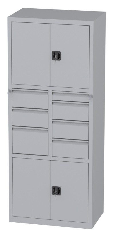 | Bemerkungen: | -Mittleres Segment: zwei Schubladen 170x415x460mm und eine Schublade 255x415x460mm; eine Schublade 85x415x460mm und drei Schubladen 170x415x460mm, -Untere und obere Segmente: Schrank mit zweiflügeligen Türen; innen je ein verstellbarer (je 35mm) Fachboden; Abmessungen innen: Höhe 595mm, Breite 995mm, Tiefe 468mm, Werkstattschrank besteht aus drei Segmenten |