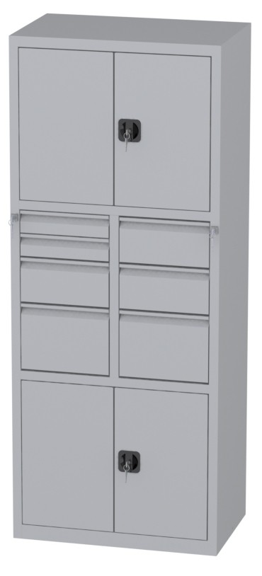 | Bemerkungen: | -Mittleres Segment: zwei Schubladen 85x415x460mm, eine Schublade 170x415x460mm und eine Schublade 255x415x460mm; zwei Schubladen 170x415x460mm und eine Schublade 255x415x460mm, -Untere und obere Segmente: Schrank mit zweiflügeligen Türen; innen je ein verstellbarer (je 35mm) Fachboden; Abmessungen innen: Höhe 595mm, Breite 995mm, Tiefe 468mm, Werkstattschrank besteht aus drei Segmenten |