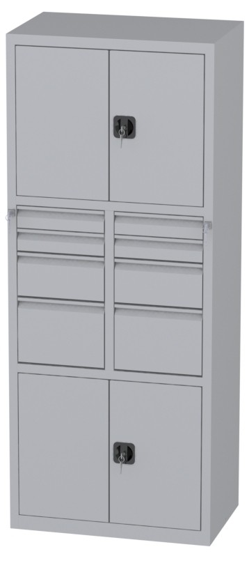 | Bemerkungen: | -Mittleres Segment: vier Schubladen 85x415x460mm, zwei Schubladen 170x415x460mm und zwei Schubladen 255x415x460mm, -Untere und obere Segmente: Schrank mit zweiflügeligen Türen; innen je ein verstellbarer (je 35mm) Fachboden; Abmessungen innen: Höhe 595mm, Breite 995mm, Tiefe 468mm, Werkstattschrank besteht aus drei Segmenten |