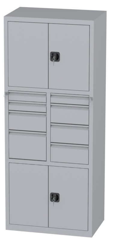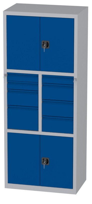 | Bemerkungen: | -Mittleres Segment: zwei Schubladen 85x415x460mm, eine Schublade 170x415x460mm und eine Schublade 255x415x460mm; eine Schublade 85x415x460mm und drei Schubladen 170x415x460mm, -Untere und obere Segmente: Schrank mit zweiflügeligen Türen; innen je ein verstellbarer (je 35mm) Fachboden; Abmessungen innen: Höhe 595mm, Breite 995mm, Tiefe 468mm, Werkstattschrank besteht aus drei Segmenten |