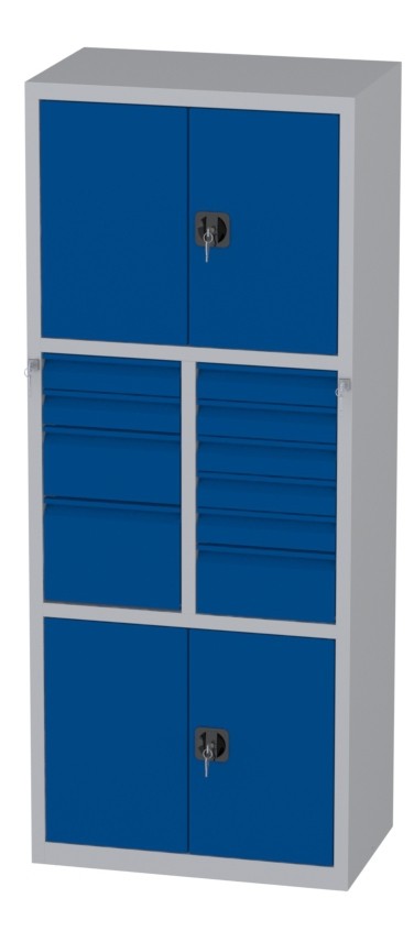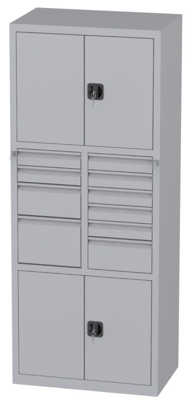 | Bemerkungen: | -Mittleres Segment: zwei Schubladen 85x415x460mm, eine Schublade 170x415x460mm und eine Schublade 255x415x460mm; fünf Schubladen 85x415x460 und eine Schublade 170x415x460mm, -Untere und obere Segmente: Schrank mit zweiflügeligen Türen; innen je ein verstellbarer (je 35mm) Fachboden; Abmessungen innen: Höhe 595mm, Breite 995mm, Tiefe 468mm, Werkstattschrank besteht aus drei Segmenten |