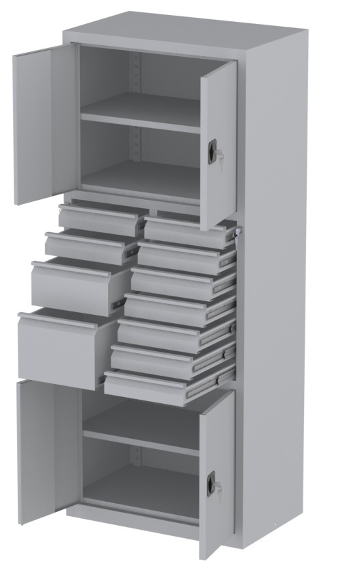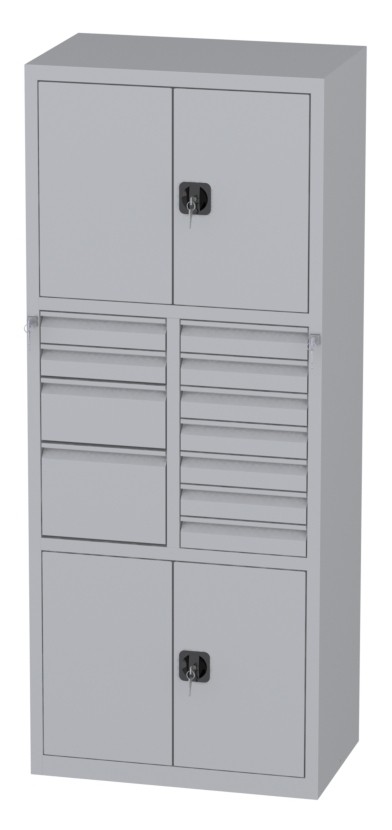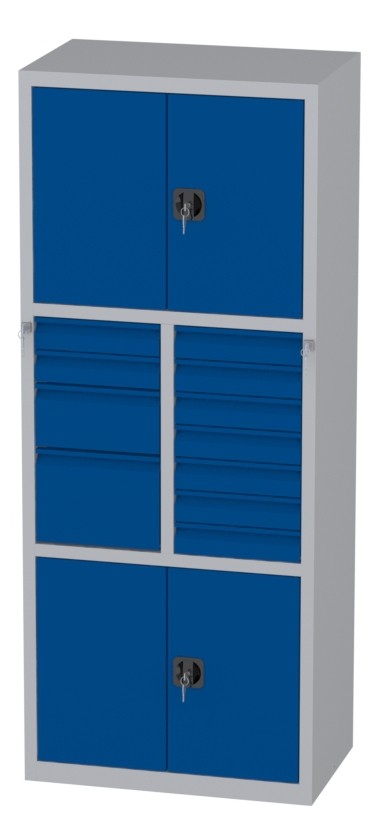 | Bemerkungen: | -Mittleres Segment: zwei Schubladen 85x415x460mm, eine Schublade 170x415x460mm und eine Schublade 255x415x460mm; sieben Schubladen 85x415x460mm, -Untere und obere Segmente: Schrank mit zweiflügeligen Türen; innen je ein verstellbarer (je 35mm) Fachboden; Abmessungen innen: Höhe 595mm, Breite 995mm, Tiefe 468mm, Werkstattschrank besteht aus drei Segmenten |