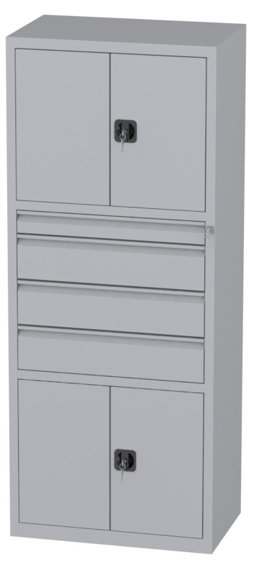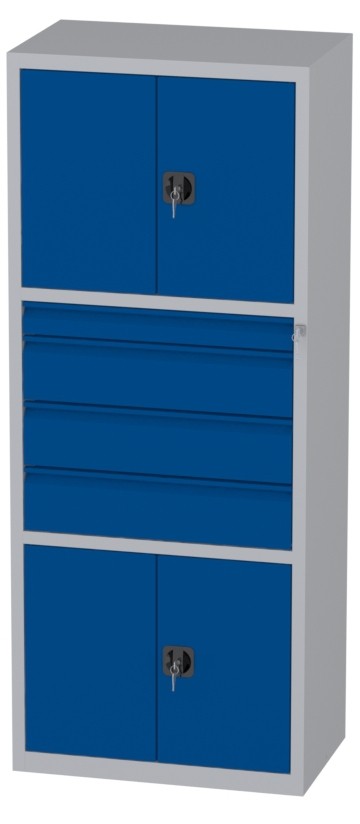 | Bemerkungen: | -Mittleres Segment: eine Schublade 85x900x460mm und drei Schubladen 170x900x460mm, -Untere und obere Segmente: Schrank mit zweiflügeligen Türen; innen je ein verstellbarer (je 35mm) Fachboden; Abmessungen innen: Höhe 595mm, Breite 995mm, Tiefe 468mm, Werkstattschrank besteht aus drei Segmenten |