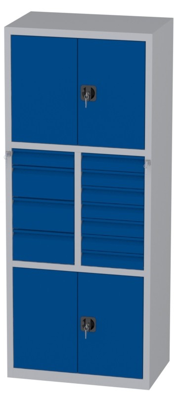 | Bemerkungen: | -Mittleres Segment: eine Schublade 85x415x460mm und drei Schubladen 170x415x460mm; sieben Schubladen 85x415x460mm, -Untere und obere Segmente: Schrank mit zweiflügeligen Türen; innen je ein verstellbarer (je 35mm) Fachboden; Abmessungen innen: Höhe 595mm, Breite 995mm, Tiefe 468mm, Werkstattschrank besteht aus drei Segmenten |