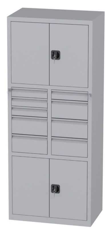| Bemerkungen: | -Mittleres Segment: drei Schubladen 85x415x460mm und zwei Schubladen 170x415x460mm; eine Schublade 85x415x460mm und drei Schubladen 170x415x460mm, -Untere und obere Segmente: Schrank mit zweiflügeligen Türen; innen je ein verstellbarer (je 35mm) Fachboden; Abmessungen innen: Höhe 595mm, Breite 995mm, Tiefe 468mm, Werkstattschrank besteht aus drei Segmenten |