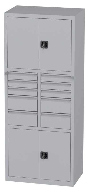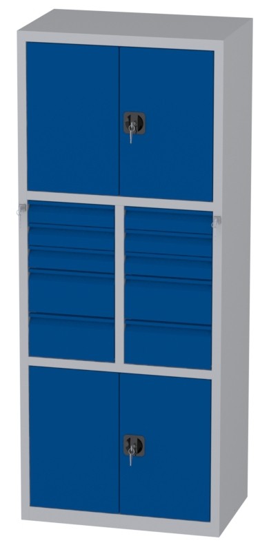 | Bemerkungen: | -Mittleres Segment: sechs Schubladen 85x415x460 und vier Schubladen 170x415x460mm, -Untere und obere Segmente: Schrank mit zweiflügeligen Türen; innen je ein verstellbarer (je 35mm) Fachboden; Abmessungen innen: Höhe 595mm, Breite 995mm, Tiefe 468mm, Werkstattschrank besteht aus drei Segmenten |