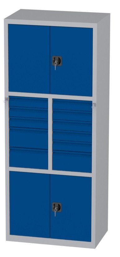 | Bemerkungen: | -Mittleres Segment: drei Schubladen 85x415x460mm und zwei Schubladen 170x415x460mm; fünf Schubladen 85x415x460mm und eine Schublade 170x415x460mm, -Untere und obere Segmente: Schrank mit zweiflügeligen Türen; innen je ein verstellbarer (je 35mm) Fachboden; Abmessungen innen: Höhe 595mm, Breite 995mm, Tiefe 468mm, Werkstattschrank besteht aus drei Segmenten |