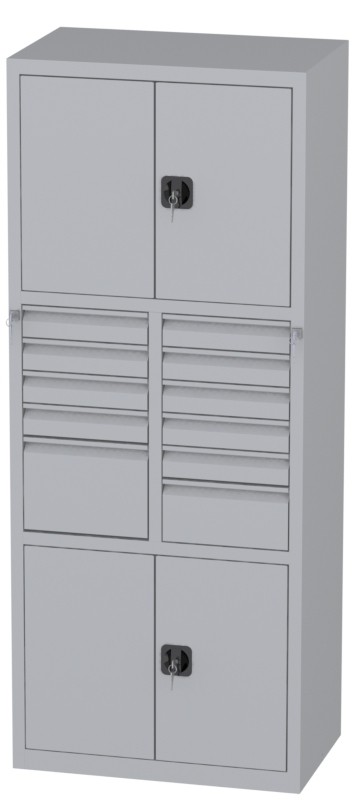 | Bemerkungen: | -Mittleres Segment: vier Schubladen 85x415x460mm und eine Schublade 255x415x460mm; fünf Schubladen 85x415x460mm und eine Schublade 170x415x460mm, -Untere und obere Segmente: Schrank mit zweiflügeligen Türen; innen je ein verstellbarer (je 35mm) Fachboden; Abmessungen innen: Höhe 595mm, Breite 995mm, Tiefe 468mm, Werkstattschrank besteht aus drei Segmenten |