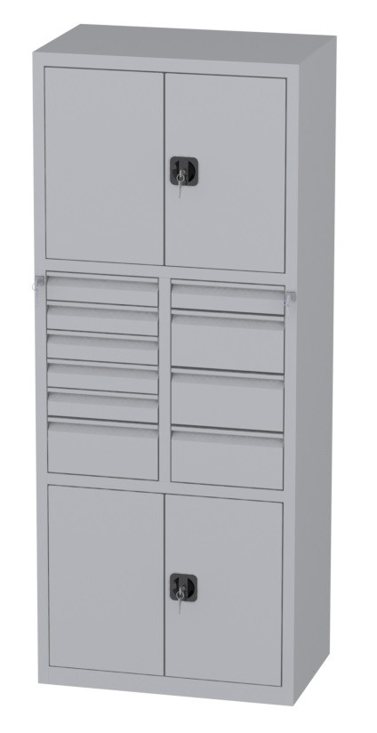 | Bemerkungen: | -Mittleres Segment: fünf Schubladen 85x415x460mm und eine Schublade 170x415x460mm; eine Schublade 85x415x460mm und drei Schubladen 170x415x460mm, -Untere und obere Segmente: Schrank mit zweiflügeligen Türen; innen je ein verstellbarer (je 35mm) Fachboden; Abmessungen innen: Höhe 595mm, Breite 995mm, Tiefe 468mm, Werkstattschrank besteht aus drei Segmenten |