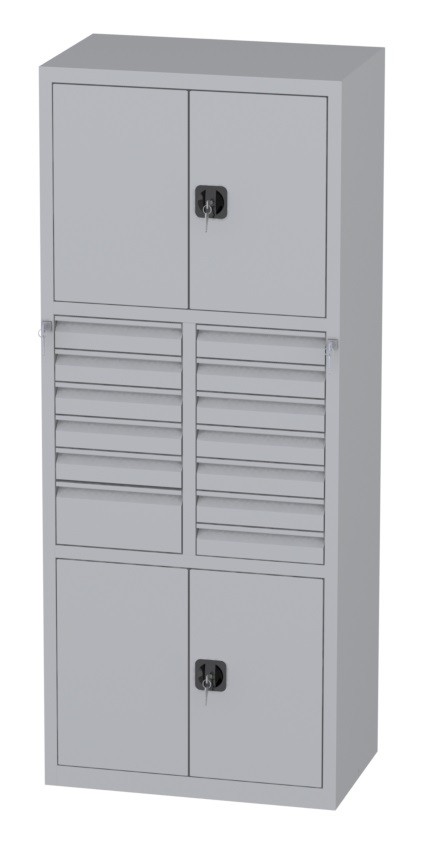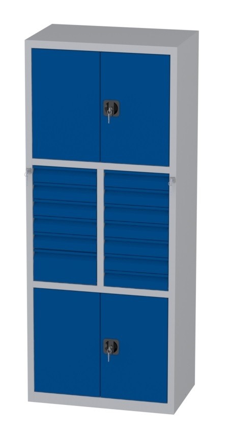 | Bemerkungen: | -Mittleres Segment: fünf Schubladen 85x415x460mm und eine Schublade 170x415x460mm; sieben Schubladen 85x415x460mm, -Untere und obere Segmente: Schrank mit zweiflügeligen Türen; innen je ein verstellbarer (je 35mm) Fachboden; Abmessungen innen: Höhe 595mm, Breite 995mm, Tiefe 468mm, Werkstattschrank besteht aus drei Segmenten |