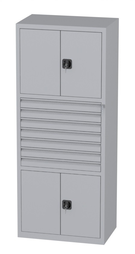 | Bemerkungen: | -Mittleres Segment: sieben Schubladen 85x900x460mm, -Untere und obere Segmente: Schrank mit zweiflügeligen Türen; innen je ein verstellbarer (je 35mm) Fachboden; Abmessungen innen: Höhe 595mm, Breite 995mm, Tiefe 468mm, Werkstattschrank besteht aus drei Segmenten |