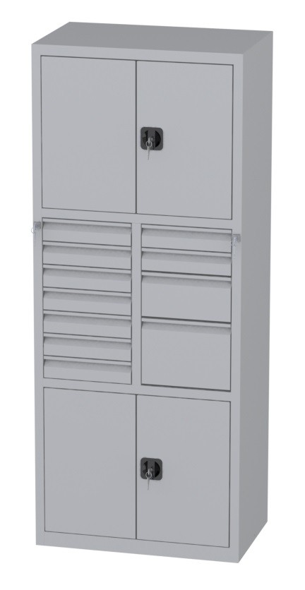 | Bemerkungen: | -Mittleres Segment: sieben Schubladen 85x415x460mm; zwei Schubladen 85x415x460mm, eine Schublade 170x415x460mm und eine Schublade 255x415x460mm, -Untere und obere Segmente: Schrank mit zweiflügeligen Türen; innen je ein verstellbarer (je 35mm) Fachboden; Abmessungen innen: Höhe 595mm, Breite 995mm, Tiefe 468mm, Werkstattschrank besteht aus drei Segmenten |