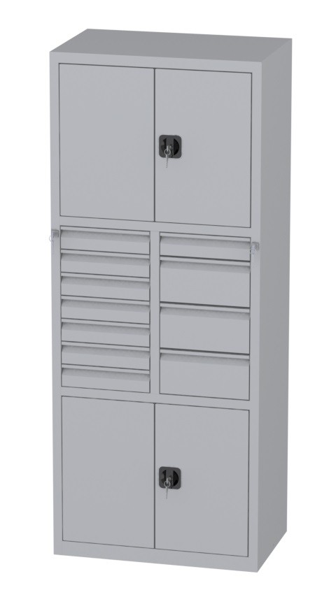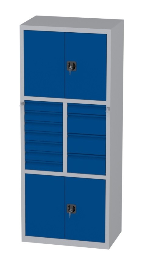 | Bemerkungen: | -Mittleres Segment: sieben Schubladen 85x415x460mm; eine Schublade 85x415x460mm und drei Schubladen 170x415x460mm, -Untere und obere Segmente: Schrank mit zweiflügeligen Türen; innen je ein verstellbarer (je 35mm) Fachboden; Abmessungen innen: Höhe 595mm, Breite 995mm, Tiefe 468mm, Werkstattschrank besteht aus drei Segmenten |
