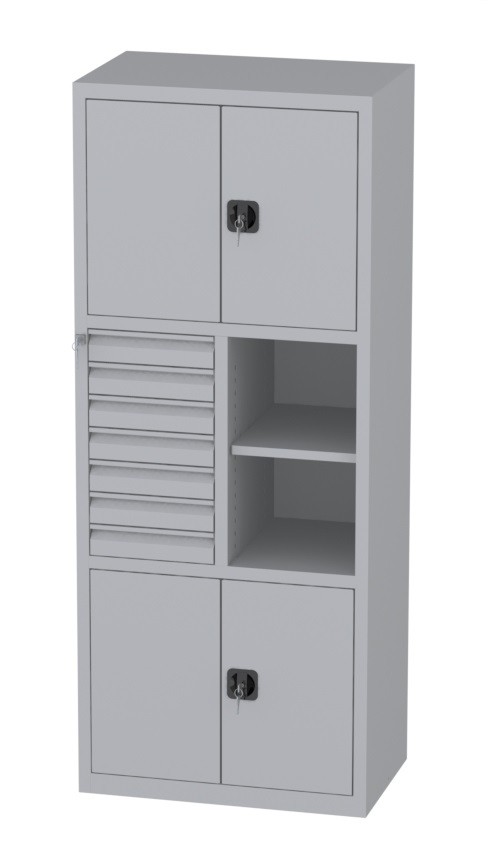 | Bemerkungen: | -Mittleres Segment: sieben Schubladen 85x415x460mm; rechts zwei Regalfächer durch einen festen Einlegeboden, -Untere und obere Segmente: Schrank mit zweiflügeligen Türen; innen je ein verstellbarer (je 35mm) Fachboden; Abmessungen innen: Höhe 595mm, Breite 995mm, Tiefe 468mm, Werkstattschrank besteht aus drei Segmenten |