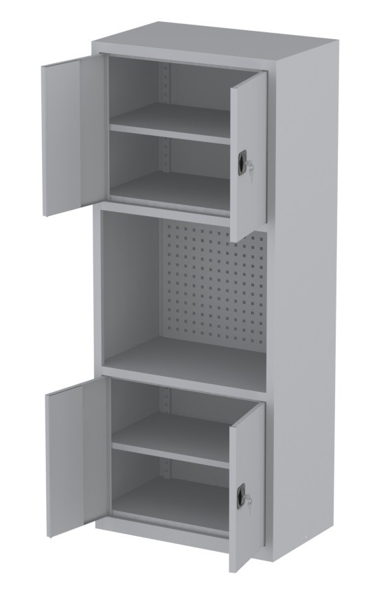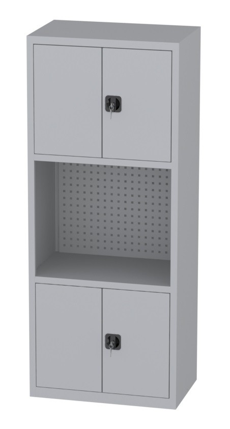 | Bemerkungen: | -Mittleres Segment: ein großes Fach mit perforierter Tafel-Rückwand, -Untere und obere Segmente: Schrank mit zweiflügeligen Türen; innen je ein verstellbarer (je 35mm) Fachboden; Abmessungen innen: Höhe 595mm, Breite 995mm, Tiefe 468mm, Werkstattschrank besteht aus drei Segmenten |