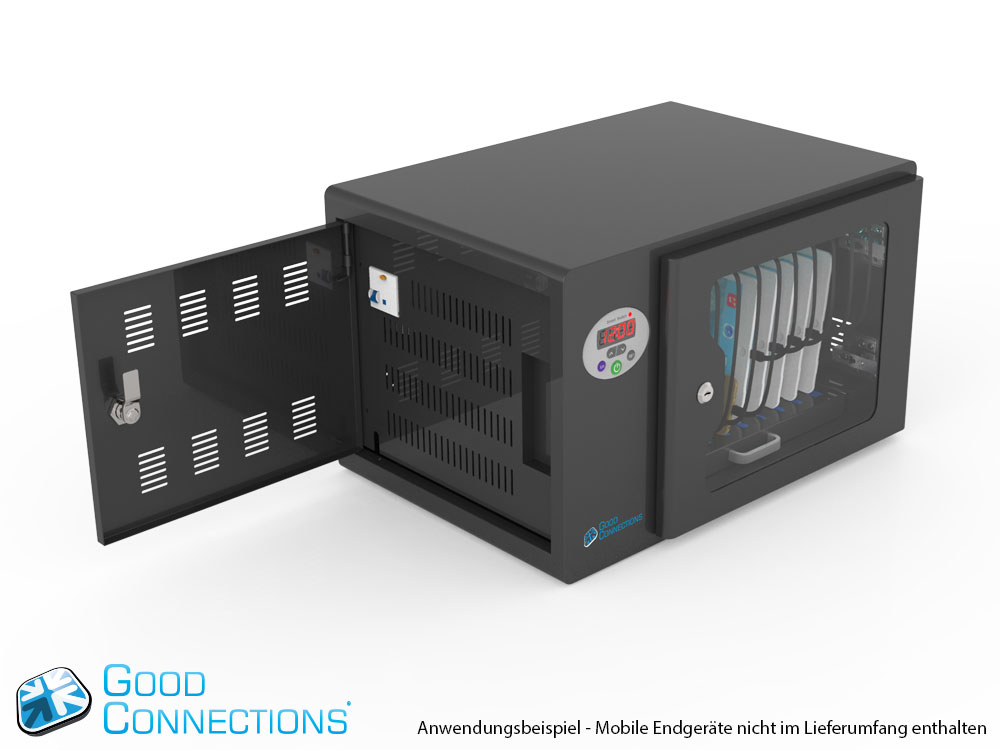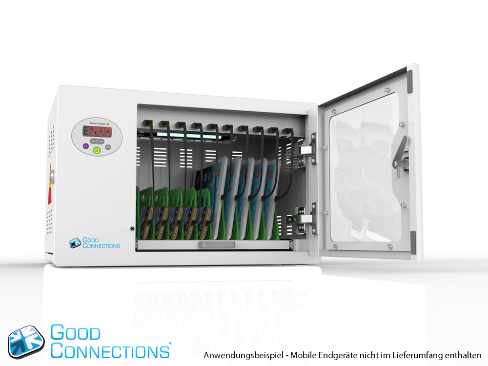 Mit dem innovativen Tablet-Ladewagen begleitet Sie Good Connections® auf den Weg der Digitalisierung und sorgt dafür, dass ihre Geräte immer einsatzbereit und geladen sind, wenn sie gebraucht werden. Sichere Aufbewahrung und energieeffiziente sowie ressourcenschonende Ladetechnik – durch seine Flexibilität und Vielseitigkeit ist der UL-zertifizierte Tablet-Ladewagen von Good Connections® der ideale Begleiter für Ihr Projekt im Bildungswesen, Gesundheitswesen, Industrie, Tagungsstätten, Hotels und der Gastronomie. Machen Sie sich keine Gedanken mehr darüber ob Sie das passende Ladegerät für ihr Tablet zur Hand haben, denn durch die USB-Ports mit intelligenter IC-Ladesteuerung benötigen Sie nur noch eine Standard-Steckdose für bis zu 65 Tablets. Eine in jeder Ladeebene angebrachte UV-C Lampe sorgt umweltfreundlich und ohne Chemie für sterilere Verhältnisse und eine verbesserte Hygiene. Die ausziehbaren und nummerierten Fächer dienen der einfachen Zuordnung der Geräte zu den einzelnen Nutzern.