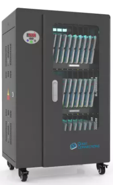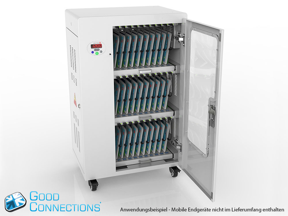 Mit dem innovativen Tablet-Ladewagen begleitet Sie Good Connections® auf den Weg der Digitalisierung und sorgt dafür, dass ihre Geräte immer einsatzbereit und geladen sind, wenn sie gebraucht werden. Sichere Aufbewahrung und energieeffiziente sowie ressourcenschonende Ladetechnik – durch seine Flexibilität und Vielseitigkeit ist der UL-zertifizierte Tablet-Ladewagen von Good Connections® der ideale Begleiter für Ihr Projekt im Bildungswesen, Gesundheitswesen, Industrie, Tagungsstätten, Hotels und der Gastronomie. Machen Sie sich keine Gedanken mehr darüber ob Sie das passende Ladegerät für ihr Tablet zur Hand haben, denn durch die USB-Ports mit intelligenter IC-Ladesteuerung benötigen Sie nur noch eine Standard-Steckdose für bis zu 65 Tablets. Eine in jeder Ladeebene angebrachte UV-C Lampe sorgt umweltfreundlich und ohne Chemie für sterilere Verhältnisse und eine verbesserte Hygiene. Die ausziehbaren und nummerierten Fächer dienen der einfachen Zuordnung der Geräte zu den einzelnen Nutzern.