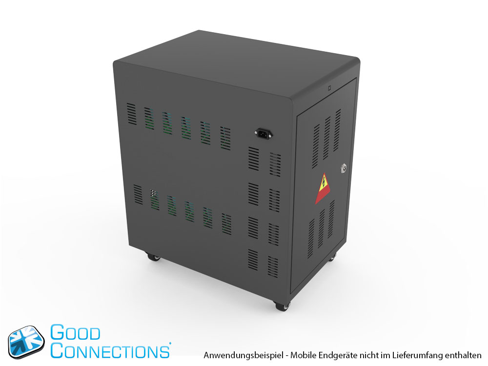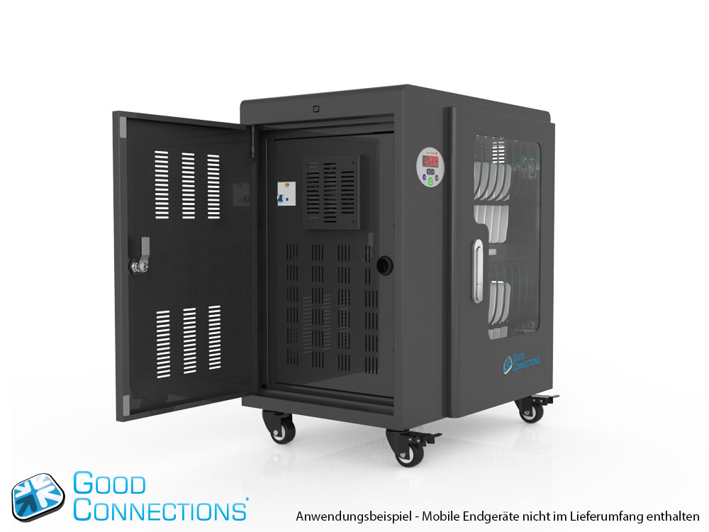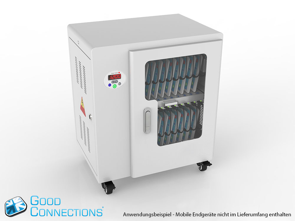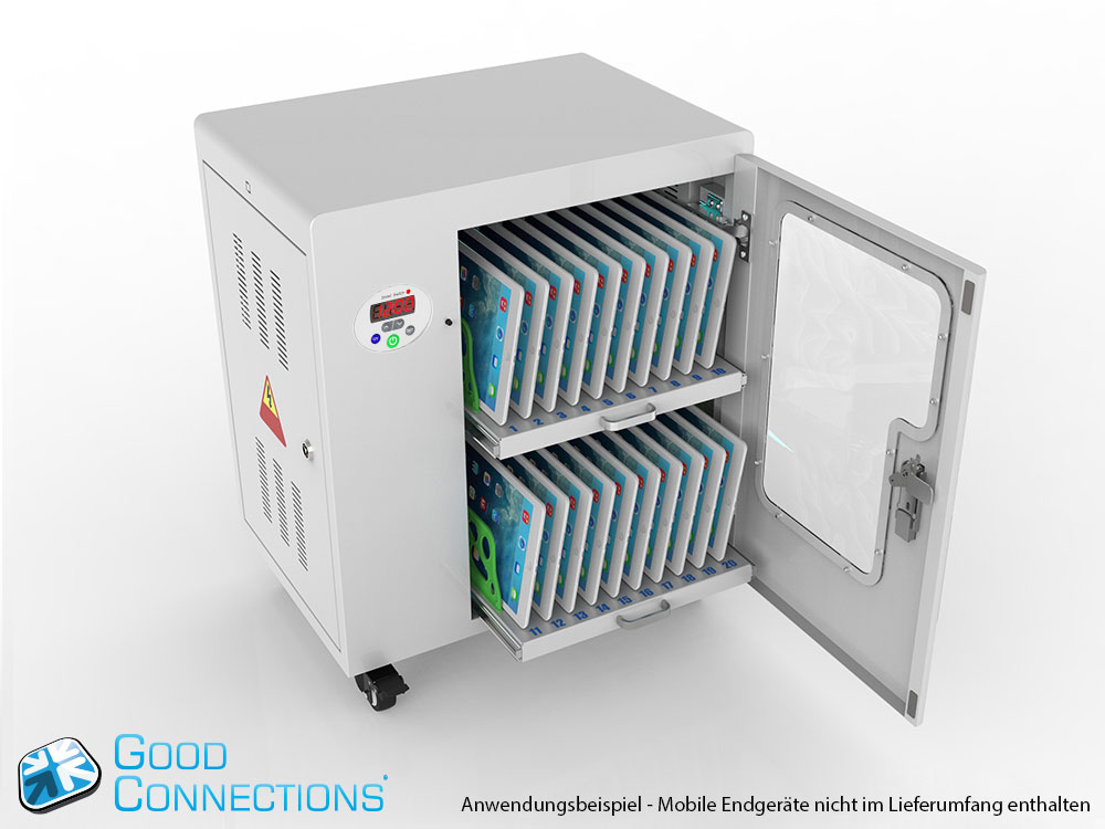 Mit dem innovativen Tablet-Ladewagen begleitet Sie Good Connections® auf den Weg der Digitalisierung und sorgt dafür, dass ihre Geräte immer einsatzbereit und geladen sind, wenn sie gebraucht werden. Sichere Aufbewahrung und energieeffiziente sowie ressourcenschonende Ladetechnik – durch seine Flexibilität und Vielseitigkeit ist der UL-zertifizierte Tablet-Ladewagen von Good Connections® der ideale Begleiter für Ihr Projekt im Bildungswesen, Gesundheitswesen, Industrie, Tagungsstätten, Hotels und der Gastronomie. Machen Sie sich keine Gedanken mehr darüber ob Sie das passende Ladegerät für ihr Tablet zur Hand haben, denn durch die USB-Ports mit intelligenter IC-Ladesteuerung benötigen Sie nur noch eine Standard-Steckdose für bis zu 65 Tablets. Eine in jeder Ladeebene angebrachte UV-C Lampe sorgt umweltfreundlich und ohne Chemie für sterilere Verhältnisse und eine verbesserte Hygiene. Die ausziehbaren und nummerierten Fächer dienen der einfachen Zuordnung der Geräte zu den einzelnen Nutzern.