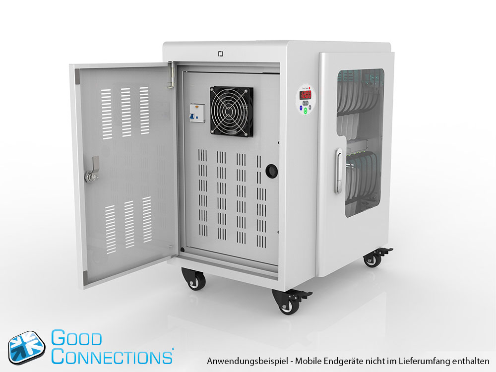Zum Schutz der Geräte ist der Ladewagen je nach Modell mit bis zu zwei leistungsstarken und leisen Lüftern und einem automatischen Temperaturkontrollsystem ausgestattet. Ab einer Netzteiltemperatur von 45 °C werden die eingebauten Lüfter aktiviert und kühlen zuverlässig die angeschlossenen Geräte.