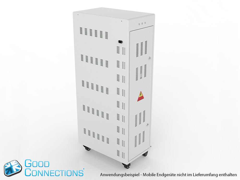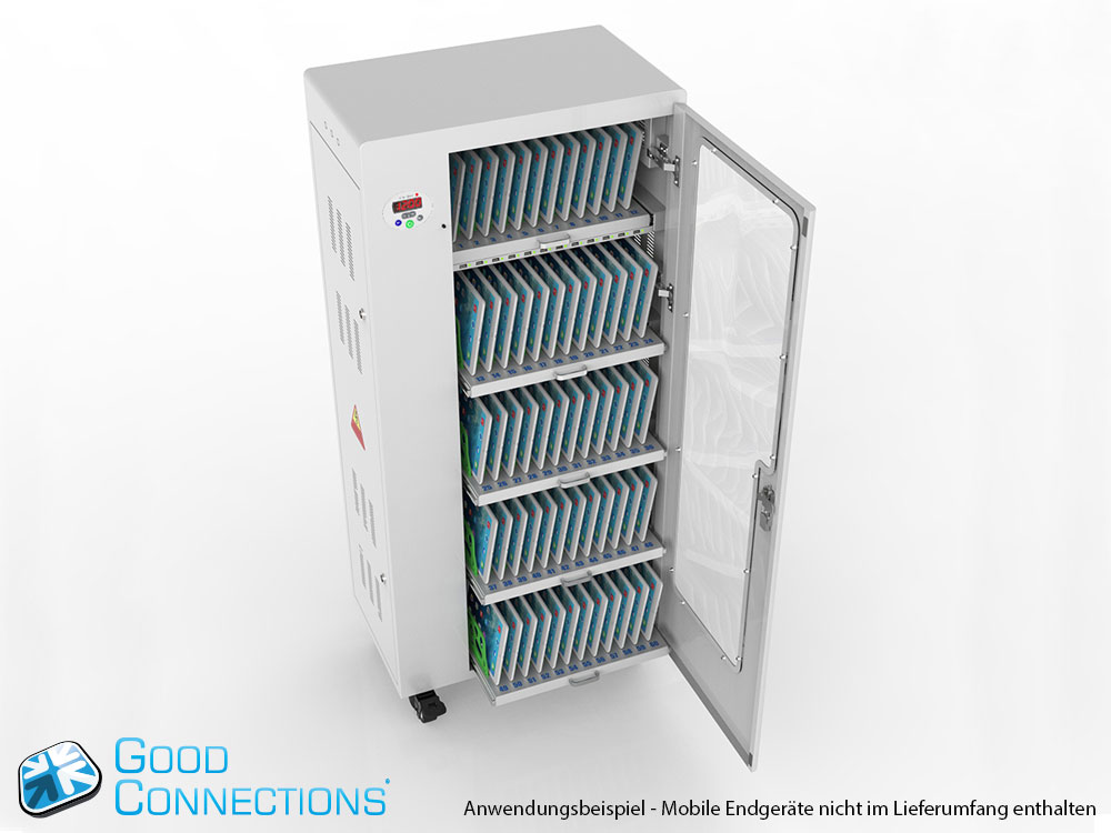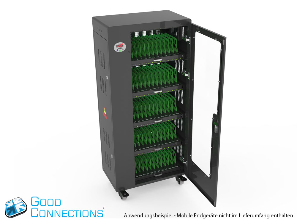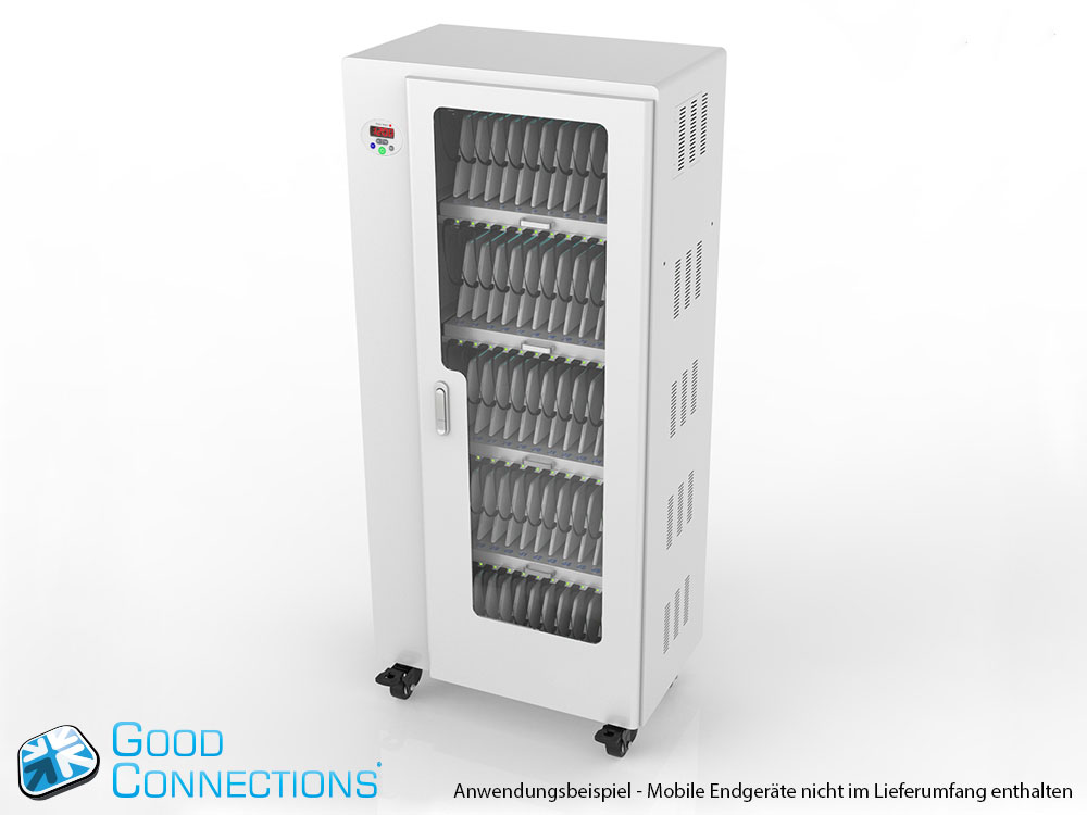 Mit dem innovativen Tablet-Ladewagen begleitet Sie Good Connections® auf den Weg der Digitalisierung und sorgt dafür, dass ihre Geräte immer einsatzbereit und geladen sind, wenn sie gebraucht werden. Sichere Aufbewahrung und energieeffiziente sowie ressourcenschonende Ladetechnik – durch seine Flexibilität und Vielseitigkeit ist der UL-zertifizierte Tablet-Ladewagen von Good Connections® der ideale Begleiter für Ihr Projekt im Bildungswesen, Gesundheitswesen, Industrie, Tagungsstätten, Hotels und der Gastronomie. Machen Sie sich keine Gedanken mehr darüber ob Sie das passende Ladegerät für ihr Tablet zur Hand haben, denn durch die USB-Ports mit intelligenter IC-Ladesteuerung benötigen Sie nur noch eine Standard-Steckdose für bis zu 65 Tablets. Eine in jeder Ladeebene angebrachte UV-C Lampe sorgt umweltfreundlich und ohne Chemie für sterilere Verhältnisse und eine verbesserte Hygiene. Die ausziehbaren und nummerierten Fächer dienen der einfachen Zuordnung der Geräte zu den einzelnen Nutzern.